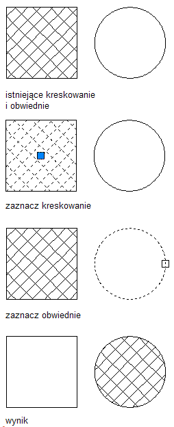 Procedura ta służy do ponownego zdefiniowania obwiedni zespolonych lub niezespolonych kreskowań w oparciu o dowolny wybrany szkic o zamkniętej obwiedni. W przypadkach, gdzie niezespolone kreskowanie wypełniało szkic o zamkniętej obwiedni, ale szkic został później rozciągnięty lub przesunięty, procedura ta umożliwia rozwinięcie lub zmianę położenia kreskowania, tak aby wypełniało obszar nowej obwiedni.