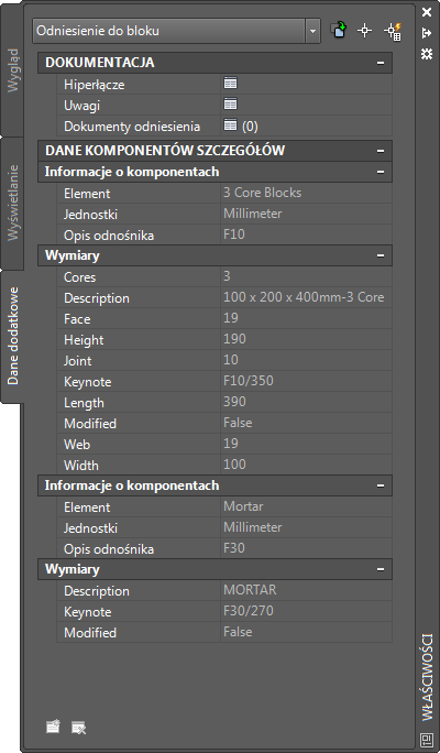 Na następującym obrazie przedstawiono kartę Dane dodatkowe palety Właściwości dla bloku szczegółu betonowego elementu murarskiego.