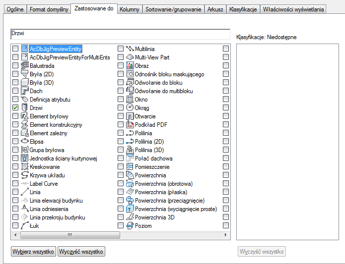 Prawe okienko zawiera listę wszystkich definicji klasyfikacji stosujących się do każdego z wybranych typów obiektów. Można wybrać wiele klasyfikacji w wielu definicjach klasyfikacji. Jeżeli zostały wybrane klasyfikacje, tabele zestawieniowe w tym stylu mogą zawierać obiekty lub style i definicje wybrane po prawej stronie, pod warunkiem że zostały sklasyfikowane za pomocą wybranych klasyfikacji.