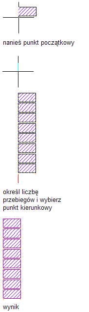 Procedura ta służy do wstawiania komponentów detali, które muszą być wstawione wiele razy w szyku liniowym, takich jak cegły. W tym przykładzie właściwość widoku narzędzia wstawiania cegieł ustawiona jest na Przekrój. Takie same zgłoszenia wyświetlane są przy ustawionym widoku Rzut. Dla ustawienia opcji Elewacja używane są monity opisane w procedurze Aby wstawić komponenty stempla. Dla ustawienia opcji Elewacja (Wzór) używane są monity opisane w procedurze Aby wstawić komponenty zasypki.