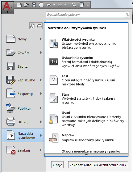 Menu aplikacji zawiera podstawowe polecenia dotyczące rysunku, takie jak: Otwórz, Zapisz, Drukuj, Eksportuj itd. Podobnie jak w przypadku zastąpionej przez menu aplikacji przeszukiwarki menu, dostęp do niej można uzyskać, klikając przycisk