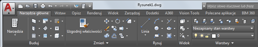 Obszar roboczy został zaprojektowany tak, aby ułatwić i przyspieszyć znajdowanie i używanie narzędzi oraz poleceń niezbędnych do wykonania bieżącego zadania.