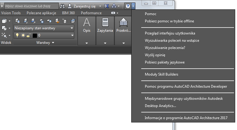 Wraz z usunięciem pasków menu polecenia dostępu do funkcji Pomocy przeniesione zostały do panelu InfoCenter w prawym górnym rogu okna aplikacji. Znajdują się tam bezpośrednie zasoby panelu InfoCenter oraz menu Pomoc, dzięki któremu użytkownik uzyskuje dostęp do pomocy, samouczka i innych zasobów interaktywnych.
