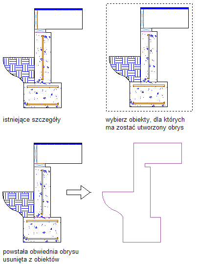 Procedura ta służy do automatycznego tworzenia profilu lub obrysu wokół dowolnego zbioru sąsiednich elementów szkicu, włączając obiekty architektoniczne. Widoczny efekt przeprowadzenia procedury jest podobny do scalania elementów, ale w tym przypadku utworzony zarys można wybierać jako osobny element. Odmiennie do innych narzędzi szkiców AEC narzędzie Obrys dostępne jest w głównej palecie narzędzi. Polecenie AECLINEWORKSHRINKWRAP wywoływane przez to narzędzie jest zawinięte w polecenie DesignCenter w celu umożliwienia kluczowania warstw (tzn. polilinie obrysów utworzone za pomocą tego narzędzia są automatycznie umieszczane na poszczególnych warstwach, zgodnie z definicją odpowiedniego klucza warstwy).