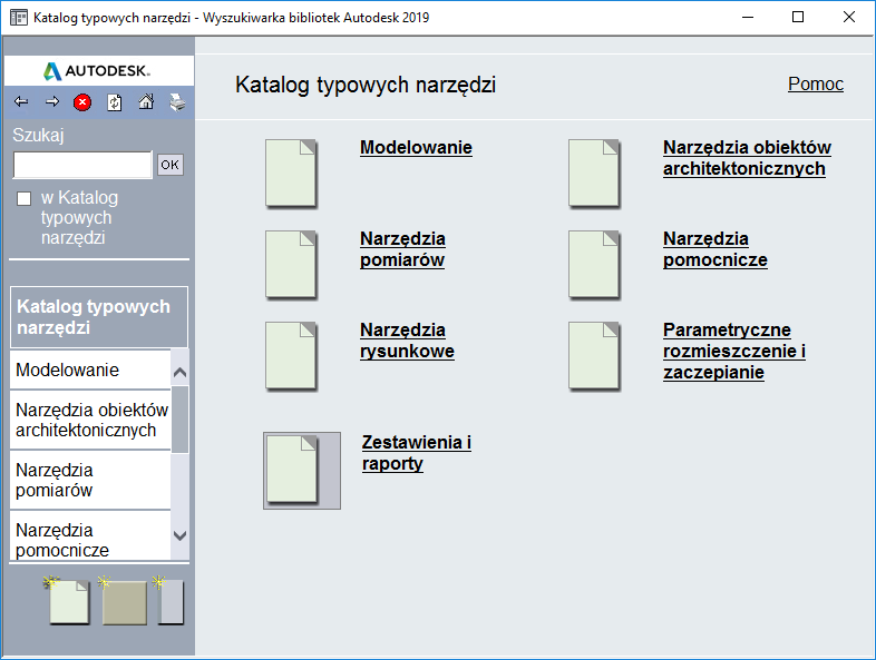 W celu przejścia ze strony tytułowej do elementów bibliotecznych katalogu narzędzi kliknij nazwę katalogu w lewym okienku okna Wyszukiwarka bibliotek.