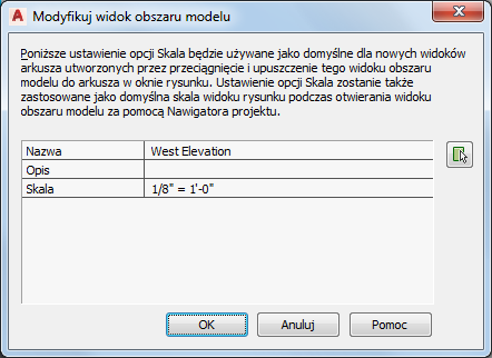 Uwaga: Zmiana właściwości widoku obszaru modelu nie powoduje aktualizacji wystąpień tego widoku umieszczonych jako widoki arkusza na arkuszach. Nowe ustawienia będą obowiązywać tylko w nowych wystąpieniach widoku obszaru modelu. Na przykład, jeśli widok obszaru modelu o nazwie Schody zachodnie był zdefiniowany ze skalą 1:100, to z taką skalą będzie umieszczany na arkuszu. Jeśli skala zostanie później zmieniona na 1:50, skala w istniejących widokach arkuszy nie zostanie zaktualizowana, ale będzie obowiązywać dla nowych widoków arkuszy.
