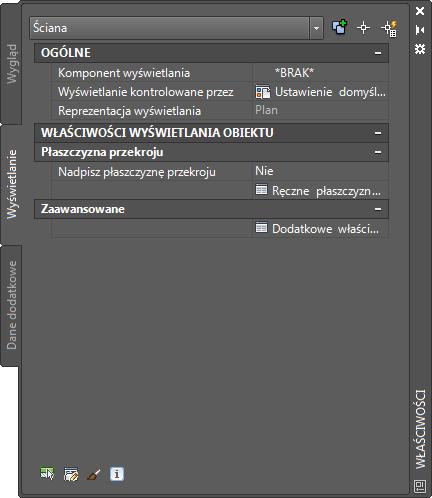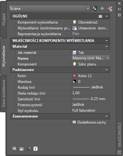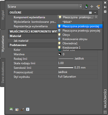 Opcje zawarte w palecie właściwości na karcie Wyświetlanie umożliwiają zmianę ustawień wybranego obiektu w bieżącej reprezentacji wyświetlania. Można zmieniać ustawienia właściwości, które dotyczą obiektu jako całości (jak wysokość płaszczyzny przekroju), jak również ustawienia poszczególnych komponentów wyświetlania obiektu (jak kolor, warstwa i rodzaj linii w przypadku komponentu kreskowania).