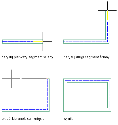Opcja ta zamyka ścianę poprzez utworzenie segmentu ściany od ostatniego punktu podanego dla ścian do pierwszego punktu określonego w tej grupie ścian. Aby użyć tej opcji podczas umieszczania ścian, w linii poleceń należy wpisać z (Zamknij).