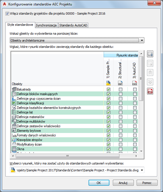 W celu ustawienia standardowych stylów i ustawień wyświetlania należy zdefiniować jeden lub więcej rysunków standardów projektu, zawierających standardy stylów i ustawień wyświetlania. Rysunki te mogą być plikami DWG, DWT lub DWS i dodawane są w oknie dialogowym konfiguracji.