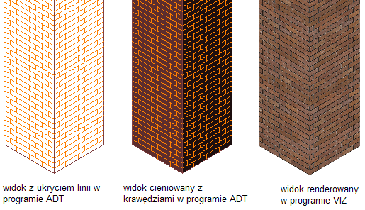 Materiały umożliwiają przypisywanie do obiektów kreskowań powierzchni. Kreskowanie powierzchni można wyświetlać w widokach modelu, przekroju i elewacji. Rozmieszczenie i orientację kreskowania można zmieniać dla każdej powierzchni obiektu.