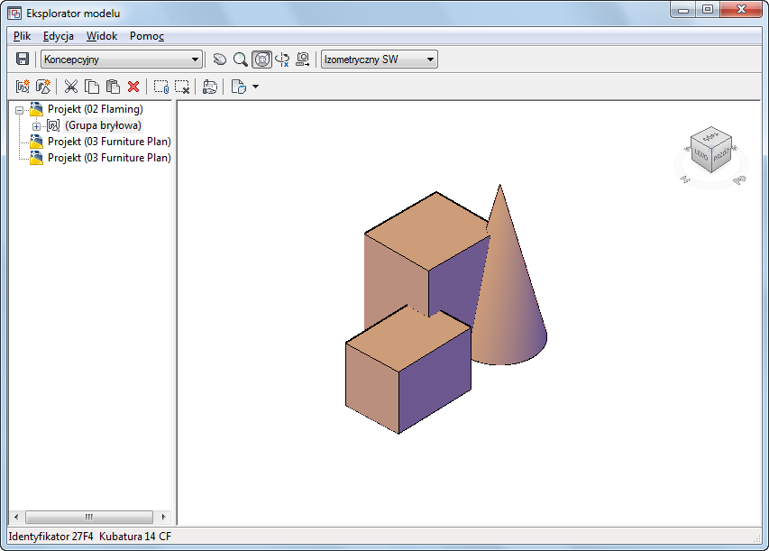 Eksplorator modelu jest oknem w którym można tworzyć i oglądać elementy bryłowe i grupy brył oraz wykonywać na nich operacje. Można utworzyć cały model koncepcyjny z pomocą Eksploratora modelu. Główne okno jest podobne do widoku Orbita 3D. Można dołączać obiekty i elementy bryłowe do grup brył i przeglądać je w Eksploratorze modelu. Można jednocześnie oglądać strukturę koncepcyjną i strukturę hierarchiczną grup brył i elementów bryłowych, które tworzą model.