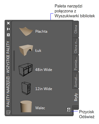 Po połączeniu palety narzędzi z katalogu w Wyszukiwarce bibliotek z zestawem palet narzędzi na dole palety zostanie wyświetlony przycisk Odśwież.