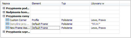Opisana poniżej procedura pozwala dodać przypisanie ramy do zestawu drzwi/okien. Aby można było zróżnicować definicje przypisywane krawędziom ramy, należy skonfigurować odpowiednią liczbę przypisań ramy.