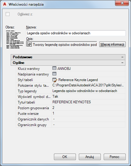 | Styl tabeli | Określa styl tabeli AutoCAD dla legendy opisu odnośnika. Możliwymi wartościami są: Legenda opisów odnośników w odwołaniach, Legenda opisów odnośników w arkuszu i Standard. Jeżeli właściwość nie została określona (--), używany będzie aktualny styl tabeli. |