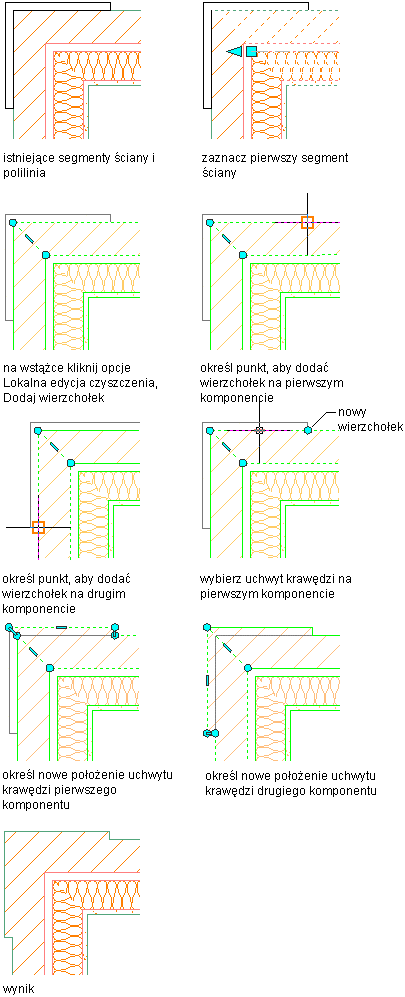 W poniższym przykładzie do komponentów dodane zostały nowe wierzchołki, a następnie za pomocą uchwytów krawędzi zmodyfikowany został warunek narożnika oblicowanego cegłą.