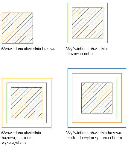 Pomieszczenia mają cztery różne obwiednie. Za pomocą obwiedni można wyświetlać, edytować i zestawiać różne elementy pomieszczenia. Można określić brak odsunięć między obwiedniami i ułożenie kolejnych obwiedni na sobie. Jeśli różnorodne obwiednie nie są wymagane, można wyłączyć komponenty wyświetlania dodatkowych obwiedni. Poniżej podano typowe przypadki stosowania pojedynczych obwiedni: