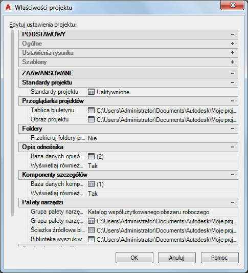 Można zdefiniować lub zmienić zaawansowane właściwości projektu, takie jak standardy, obrazy, opisy odnośników, komponenty detali i palety narzędzi.