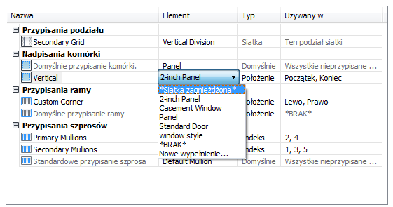- Rozwiń kolejno menu Obiekty architektoniczne i Style ścian kurtynowych.