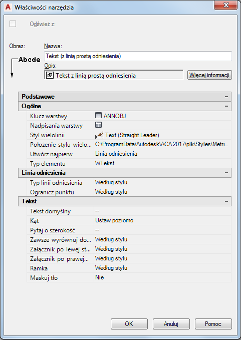 - Teksty i etykiety w oznaczeniach zestawieniowych powinny być obiektami WTEKST. Obiekt WTEKST powiązany z definicją właściwości zostanie automatycznie przekonwertowany na prawidłowo sformatowaną definicję atrybutu.