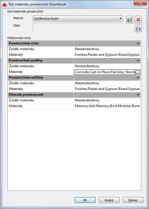 Program Roombook zawiera zestaw wstępnie zdefiniowanych stylów materiałów powierzchni, które mogą zostać wczytane do rysunku. Style materiałów powierzchni można edytować, zapisywać, kopiować, usuwać, importować i eksportować.