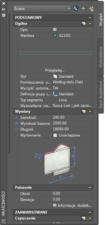 Paleta właściwości udostępnia położenie centralne umożliwiające wyświetlanie i modyfikowanie fizycznych i graficznych właściwości obiektu. Może to być obiekt, który dopiero ma zostać narysowany, lub obiekt już wybrany w obszarze rysunku. Używając karty Dane dodatkowe, znajdującej się w palecie właściwości, można również do obiektów dołączać inne rodzaje informacji, takie jak klasyfikacja, uwagi, dokumenty odniesienia, hiperłącza i dane zestawów właściwości. Podczas sesji programu AutoCAD Architecture toolset paleta Właściwości jest zwykle stale otwarta.