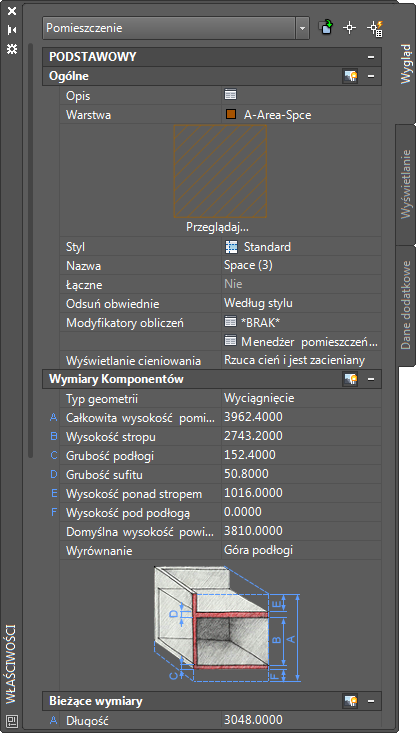 - Aby zastosować modyfikator do obwiedni powierzchni netto, powierzchni użytkowej i brutto, utwórz i zastosuj definicję zestawu właściwości zawierającą właściwości w postaci obliczonej powierzchni i obwodu tych obwiedni.