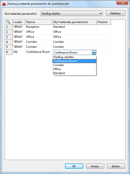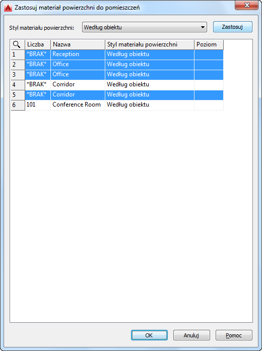 Wszystkie pomieszczenia na rysunku są wyświetlone w oknie dialogowym, z informacjami o numerze, nazwie i poziomie. Można edytować wyłącznie informacje o stylu materiału powierzchni.