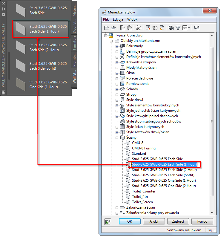. Jeżeli na przykład chcesz utworzyć narzędzie ściany ze stylem Stud-3.625 GWB-0.625 Each Side (1 Hour), rozwiń opcję Style ścian i wybierz styl Stud-3.625 GWB-0.625 Each Side (1 Hour).