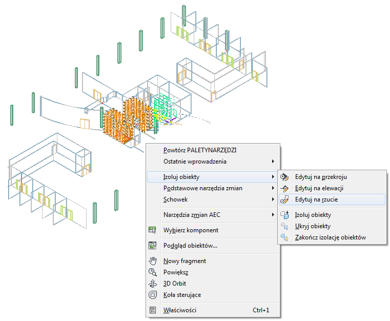 Istnieje możliwość wybrania obiektów na rysunku oraz ich wyświetlenia i edycji w tymczasowym widoku - przekroju, widoku elewacji lub widoku w planie. Podczas edycji LUW zostanie wyrównane względem widoku tymczasowego.