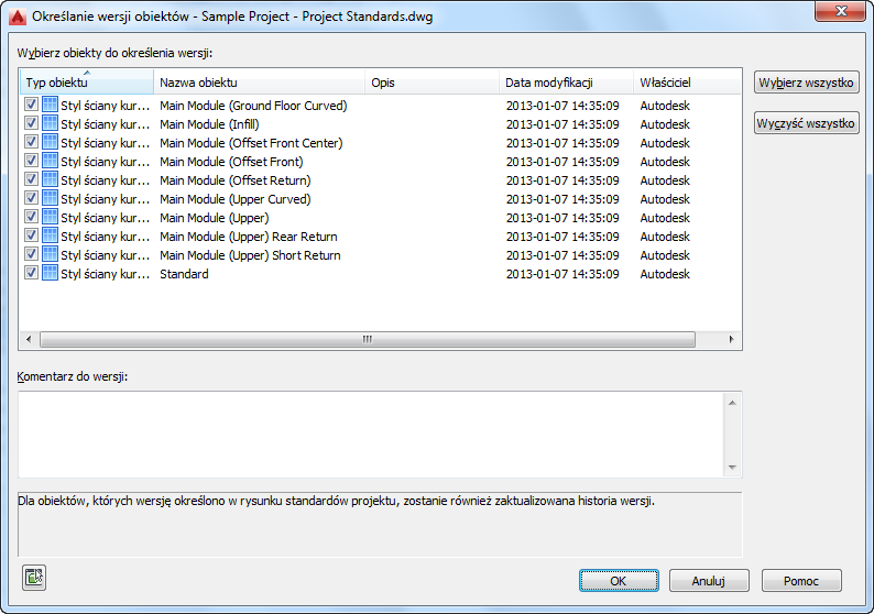 Komentarz będzie zastosowany do wszystkich obiektów wybranych do rejestracji jako nowa wersja.