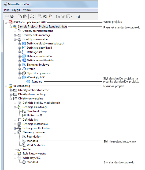 Istnieje możliwość zmiany standardowego stylu lub ustawienia wyświetlania w rysunku standardów projektowych. W przypadku wprowadzenia zmiany wymagane jest oznaczenie jej wersji i zsynchronizowanie projektu ze zmianą.