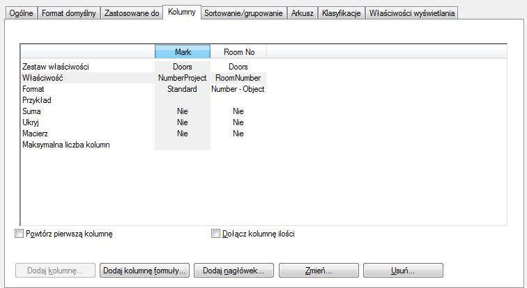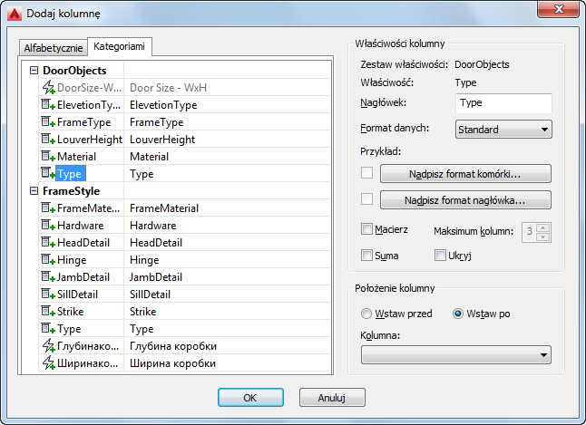 Przed dodaniem kolumn należy także określić obiekty, do których będzie można zastosować styl tabeli zestawieniowej.