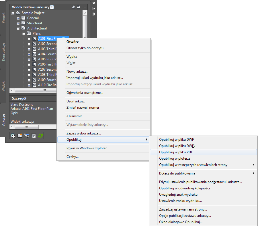 W widoku zestawu arkuszy można publikować arkusze do plotera, pliku PDF, DWF lub pliku DWFx. Istnieje możliwość przypisywania znaków wydruku do zestawu arkuszy, publikowania arkuszy z alternatywnymi ustawieniami strony oraz określenia ustawień publikacji w formacie PDF, DWF i DWFx.