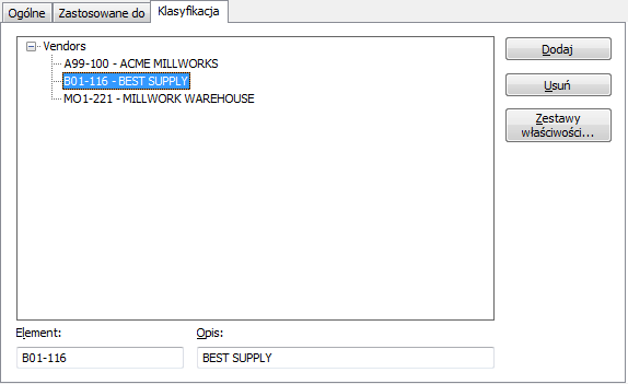 Jeżeli na przykład zostanie utworzona definicja klasyfikacji dla dostawców, do każdej klasyfikacji dostawcy można dołączyć zestaw właściwości. Zestawy właściwości mogą zawierać dowolne właściwości określone przez użytkownika, np. przypisany danemu dostawcy numer części. właściwości są następnie kojarzone z każdym obiektem, do którego przypisano klasyfikację. Te właściwości mogą być następnie zawarte w tabeli zestawieniowej po zestawieniu obiektów.