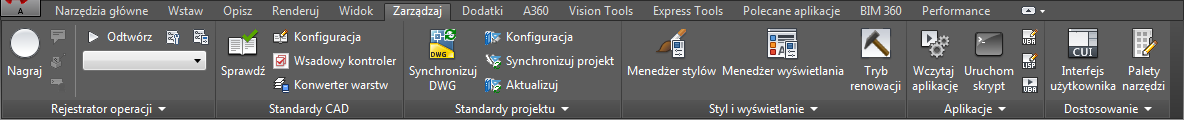 Karta Zarządzaj zawiera funkcje przeznaczone dla zaawansowanych użytkowników i menedżerów CAD.