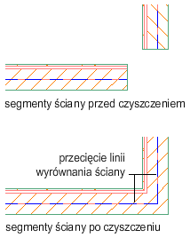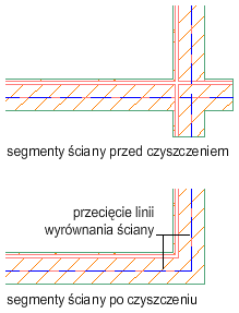- Segmenty ścian, które się przecinają, są przycinane do uzyskania warunku wyraźnego narożnika z przecinającymi się liniami wyrównywania ścian.