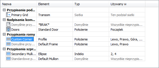 Po utworzeniu definicji elementów stylu zestawu drzwi/okien można je nadawać poszczególnym rodzajom składników zestawów: podziałom, wypełnieniom komórek, ramom i szprosom.