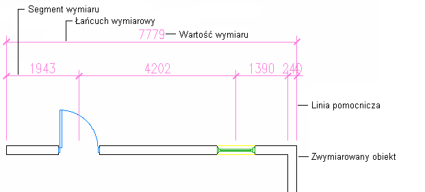 Podczas wymiarowania komponentów ściany jako punktu wymiaru można użyć środka komponentu lub dowolnego jego boku. Można na przykład wymiarować komponent ściany od jego środka lub od wybranej krawędzi. Komponenty ściany można też wymiarować zgodnie z funkcją pełnioną w konstrukcji.