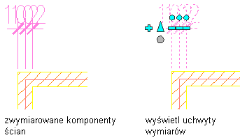 Uchwyty indywidualnych punktów wymiaru komponentu umożliwiają nadpisanie zdefiniowanych stylem punktów wymiaru na ścianach w celu dostosowania ich do nietypowych sytuacji.