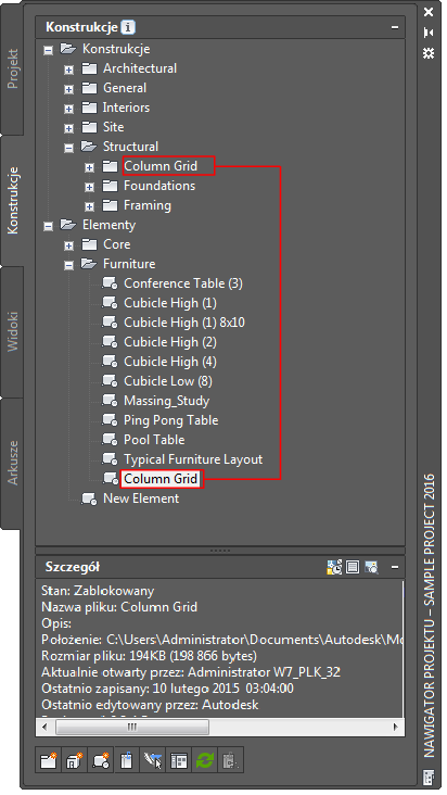 - Nie przeciągać konstrukcji do folderu elementów w Eksploratorze Windows. Spowoduje to powstanie niezgodności danych projektu.