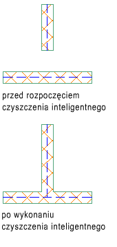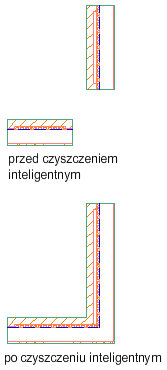 Użyj funkcji czyszczenia inteligentnego do czyszczenia przecięć ścian. Niewspółliniowe segmenty ścian są ucinane lub przedłużane w celu uzyskania oczyszczonych narożników. Wybierz segmenty ścian i określ metodę czyszczenia. Zazwyczaj wybór obwiedni skutkuje uzyskaniem czyszczenia teowego. Jeżeli nie zostanie wybrana żadna obwiednia, będzie to skutkować uzyskaniem czyszczenia kątowego.