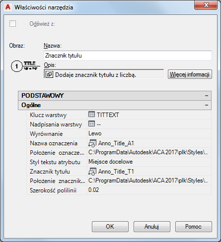 | Klucz warstwy | Ogólne | Domyślnie znacznik tytułu skojarzony z narzędziem znaczników opisowych wstawiany jest na tej samej warstwie, co utworzony widok obszaru modelu. Jednak istnieje możliwość zdefiniowania innej warstwy dla znacznika tytułu poprzez wybranie w tym miejscu innego klucza warstwy. |