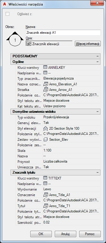 | Strzałka | Przekrój/elewacja | Definiuje blok dla strzałki znacznika przekroju/elewacji. |