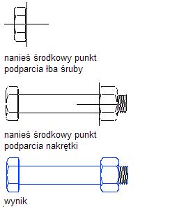 Procedura ta służy do wstawiania komponentów śruby, kiedy konieczne jest określenie odległości między łbem śruby a nakrętką. W tym przykładzie właściwość widoku narzędzia do wstawiania śruby ustawiona jest na Bok. W przypadku ustawienia Łeb lub Nakrętka nie będzie pojawiało się zgłoszenie o wykonanie dwóch pierwszych kroków.
