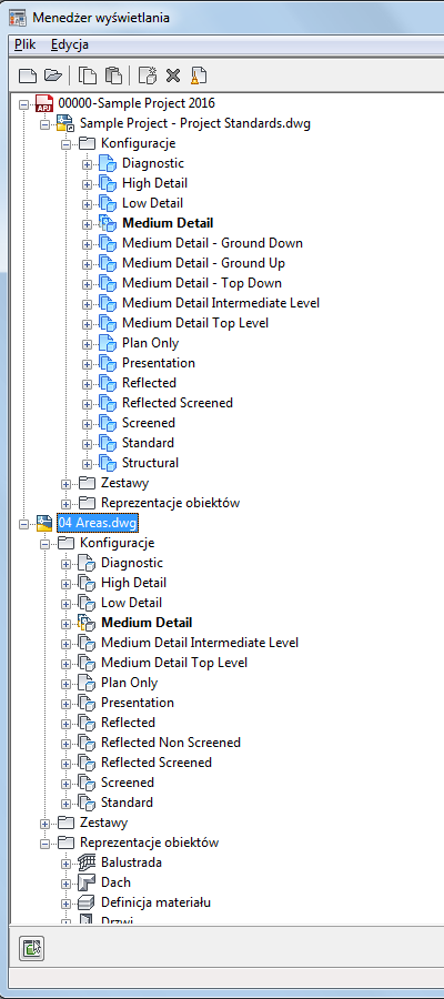Standardowe style i ustawienia wyświetlania wyświetlane są w Menedżerze stylów i Menedżerze wyświetlania. W zależności od ich stanu w odniesieniu do standardów projektowych dostępnych jest wiele różnych ikon umożliwiających ich rozróżnienie.