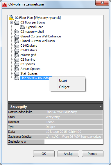 Uwaga: Odnośniki zewnętrzne można również wyświetlić, otwierając konstrukcję w obszarze rysunku programu AutoCAD Architecture toolset i używając Menedżera odnośników zewnętrznych programu AutoCAD.