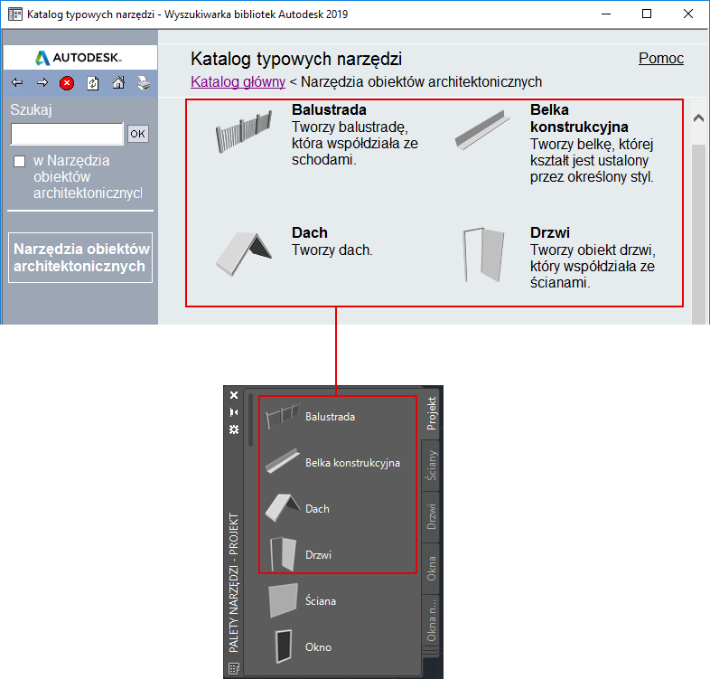 Procedura ta umożliwia połączenie narzędzia z katalogu w Wyszukiwarce bibliotek z paletą narzędzi w programie AutoCAD Architecture toolset.