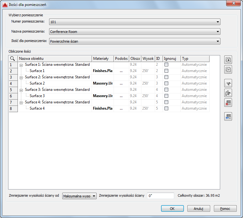 Można na przykład dodać do kategorii „powierzchnie ścian” inną ścianę, która w rzeczywistości nie należy do pomieszczenia, ale wymagane jest jej obliczenie.