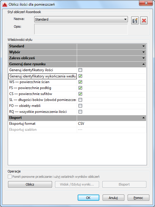 - W oknie dialogowym Oblicz ilości dla pomieszczeń, w obszarze Właściwości stylu, na liście Generuj dane rysunku wybierz pozycję Generuj identyfikatory wykończenia według materiału.