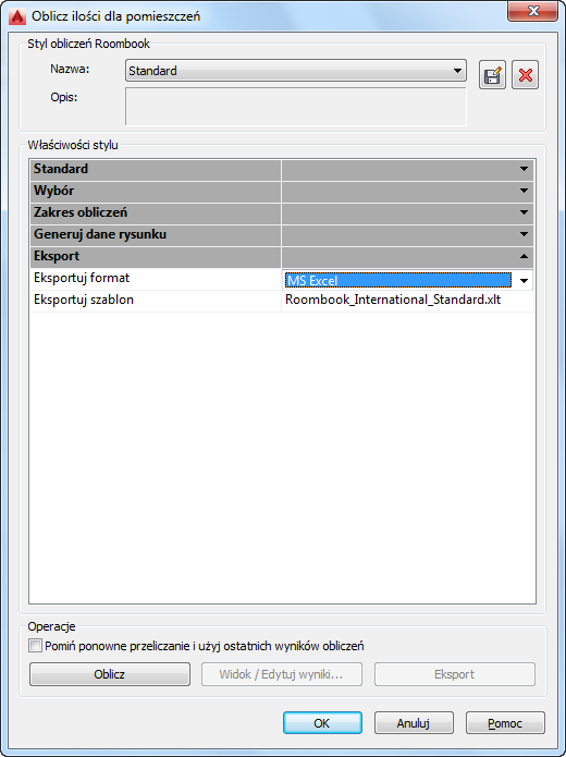 W programie Roombook znajdują się wstępnie zdefiniowane formularze eksportu do programu MS Excel dla każdego standardu obliczeń zawierające listę wszystkich obliczonych ilości dla pomieszczeń uporządkowaną w jednym arkuszu.
